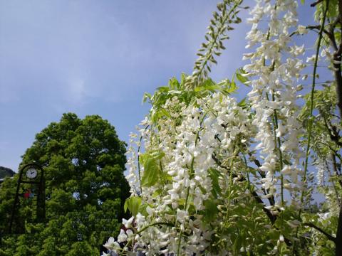 写真はフルーツパークで盛りの白藤。例年GWにはもう散っているそうですが今年は寒かったり暑かったりでどうも花期が遅かったようです。